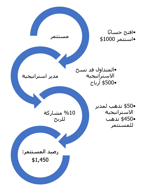 على سبيل المثال، تستثمر 1000$ في حسابك وتختار السيد × كمدير استراتيجية مقابل رسوم أداء متفق عليها تبلغ 10%. تنسخ استراتيجية تداول السيد × وتدعها تعمل على أموالك وتراقبها. لاحقًا، ترى أن التداولات قد حققت 500$ أرباح. لذا، يحق لمدير الاستراتيجية الخاص بك أن يحصل على 10% من هذه الأرباح والتي تبلغ 50$. ويذهب باقي المبلغ 450$ إلى حسابك.